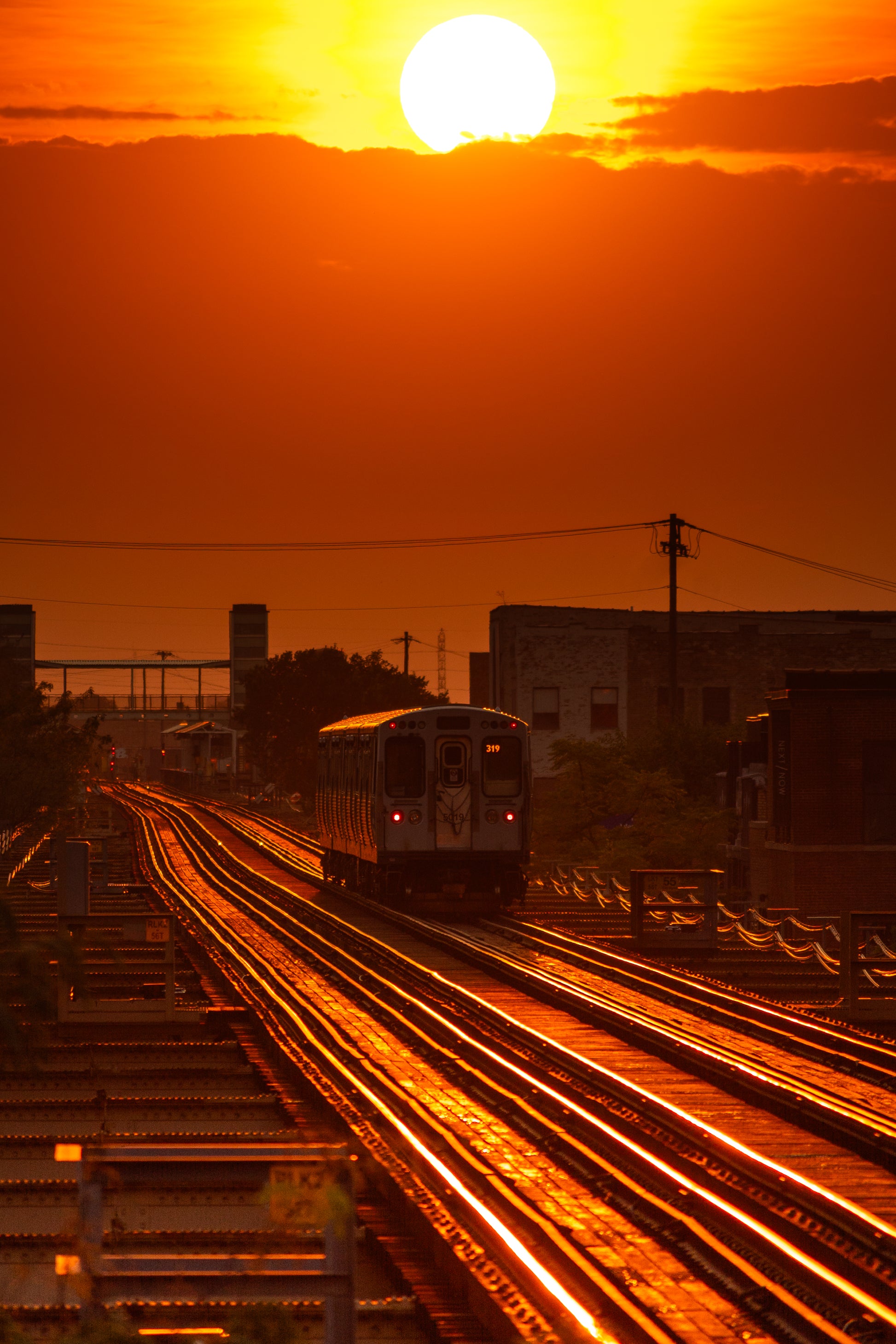 Transform your screen with the warm, golden glow of Chicago's iconic Lake/State and Morgan CTA stations at golden hour. This stunning digital wallpaper captures the elevated tracks bathed in rich amber light.